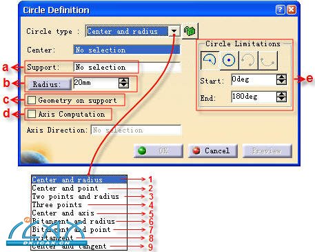 e.“圆限制 (Circle Limitations)”栏。允许用户根据“圆限制 (Circle Limitations)”栏相应的活动按钮作相应不同的结果。  部分圆(Part Arc)。允许用户创建圆或圆弧。选中该按钮后“起点 (Start)”和“终点 (End)”选项处于活动状态,允许用户定义圆弧的起点和终点的角度值。该指令适用于图4-261所示的1、2、5类型。  整圆(Whole Circle)。选中该按钮后创建的结果是一个整圆。该指令适用于创建圆的所有类型。  修剪圆(Trimmed Circle)。允许用户创建圆弧段,圆弧段修剪的位置取决于作为创建圆定义的参考元素。  补充圆(Complementary Circle)。用于修剪圆的补充,选中该按钮后,创建的结果将是修剪圆的另一部分。该指令适用于图4-261所示的3、4、6、7、8类型。
