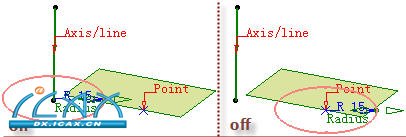 d.“轴线计算 (Axis Computation)”选项。允许在创建或修改圆或圆弧时自动创建轴线。开启该选项后,“轴线方向 (Axis direction)”选项处于活动状态。如果未选择方向,将创建垂直于圆的轴线,图4-263列出了开启与关闭该选项的预览结果。