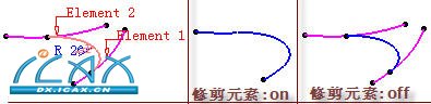 6.双切线和半径(Bitangent and radius) 。允许用户定义两个元素和支持面并输入值来创建圆或圆弧。这里选择文档中的“草图.2(Sketch.2)”和“草图.3(Sketch.3)”作为创建与圆相切的“元素 1(Element 1)”和“元素 2(Element 2)”,定义“xy平面(xy plane)”作为“支持面 (Support)”,输入“半径 (Radius)”值20mm并选中“圆限并选中“圆限制 (Circle Limitations)”栏的“修剪圆(Trimmed Circle)”按钮,单击“预览 (Preview)”如图4-271所示。图示中列出了开启与关闭“修剪元素 (Trim Element )”选项的不同结果。