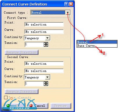 单击“连接曲线 (Connect Curve)” 指令。出现“连接曲线定义 (Connect Curve Definition)”对话框。单击“连接类型 (Connect type)”对话框的下拉小箭头,列出了两种定义连接的类型,如图4-282所示。