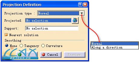 1) 投影 (Projection)。允许用户将点、线框或点和线框的任意组合几何投影到曲面上或支持面上。 激活“投影 (Projection)”指令  后,出现“投影定义 (Projection Definition)”对话框和“工具控制板 (Tools Palette)工具栏”,这意味着需要投影的几何系统是允许框选的。单击“投影类型 (Projection type)”对话框的下拉小箭头,列出了投影指令的两种投影方式,如图4-221所示。