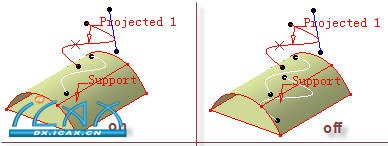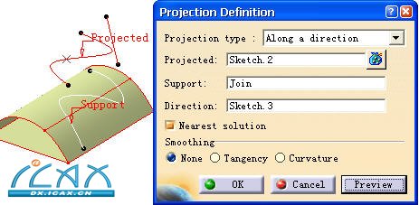 单击“投影 (Projection)” 指令。出现图4-221所示的“投影定义 (Projection Definition)”对话框,定义“草图.2(Sketch.2)”为“投影对象 (Projected)”,“缝合(Join)”为“支持面 (Support)”: a.定义“投影类型((Projection type))”为“垂直(Normal)”,图4-223列出了开启与关闭“近接解法 (Nearest Solution)”选项不同结果。