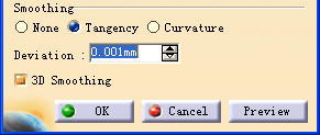 一般而言,投影操作有一个副作用,即当将元素投影到支持面上时,可能失去连续,投影后的结果将继承支持面的连续性。如有需要,用户可通过光顺栏(Smoothing)的连续选项来光顺投影的结果。如果投影结果不能正确进行光顺,将显示警告信息;这时用户可以启动“3D 光顺 (3D Smoothing)”选项(如图4-226)以获得光顺;如想获得更好连续质量,用户可以在“偏差 (deviation)”选项中输入更大的偏差值。