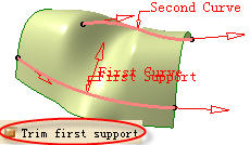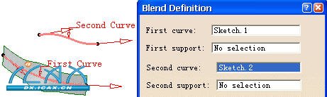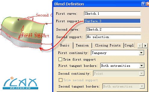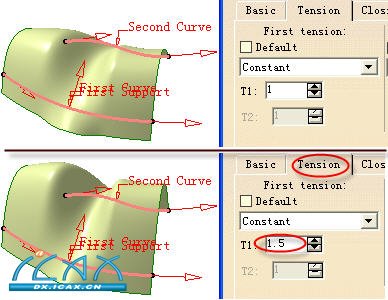 3)桥接曲面。允许用户创建两个截面之间的桥接曲面。注意,在创建桥接曲面时,用户必须确保截面的箭头方向是一致的。 图4-3111 如有需要,可为相关截面定义一个约束支持面,这里为第一曲线定义一约束支持面,如图4-3113所示。 图4-3113 如有可能,用户可以实时修剪约束支持面;这里开启“修剪第一支持面(Trim first support)”选项,参考图4-3114所示。 图4-3114 如有需要,用户可输入张力值以改变曲面与支持面的曲率,图4-3115所示列出了不同张力值的效果。 图4-3115 所需元素定义后,单击“确定 (OK)”创建桥接曲面,桥接曲面(标识为Blend.xxx)即被添加到特征树中。 |