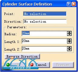 4)圆柱(Cylindrical)面创建。选择圆的中心点并指定拉伸方向来创建圆柱曲面,该指令可视为是拉伸指令中的一个简易操作。 打开\Training Part\GSD\Cylinder.CATPart文档。单击“圆柱面 (Cylinder)”  指令,出现“圆柱面曲面定义 (Cylinder Surface Definition)”对话框,如图4-311所示。 图4-311
