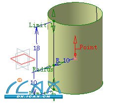 选择“点.1(Point.1)”作为圆柱轮廓中心的“点 (Point)”,“xy 平面(xy plane)”作为圆柱拉伸的参考“方向 (Direction)”,输入圆柱“半径(Radius)”值10mm,输入“长度 1(Length 1)”18mm和“长度 2(Length 2)”10mm,预览中的3D几何如图4-312所示。