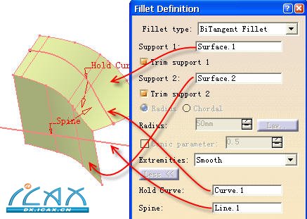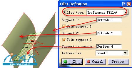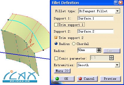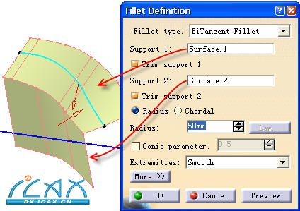 所需元素定义后,单击“确定 (OK)”创建倒圆,倒圆曲面(标识为Fillet.xxx)即被添加到特征树中。