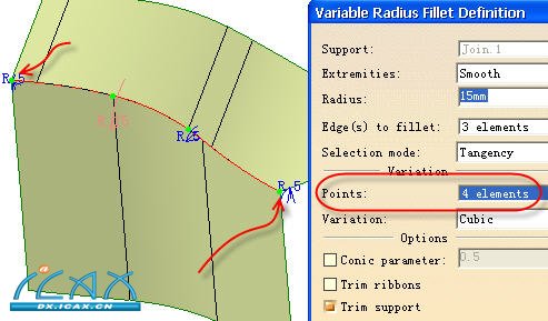 3)可变倒圆。该指令允许用户创建曲面间锐角边的可变圆角。
