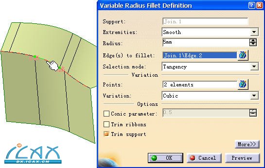 如有需要,用户可通过单击“更多(More)”按钮以访问更多关于倒圆控制的相关选项,有关这些选项的更多描述请参考零部件工作台可变圆角  的相关选项。