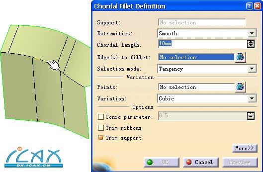 所需元素定义后,单击“确定 (OK)”创建弦圆角,弦圆角(标识为EdgeFillet.xxx)即被添加到特征树中。