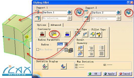 打开\Training Part\GSD\ Styling Fillet.CATPart文档,单击“样式圆角(Styling Fillet)”  指令,参考图4-462所示的选择设置,注意图示圈中的选项要开启,单击“应用(Apply)”按钮,预览中的3D几何如图4-463所示。