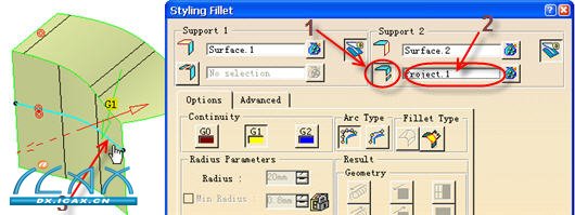 5)样式圆角。该指令允许用户多样式圆角,它包括一般、可变圆角和弦圆角,它还提供点连续、相切连续和曲率连续三种连续方式。 打开\Training Part\GSD\ Styling Fillet.CATPart文档,单击“样式圆角(Styling Fillet)”  指令,参考图4-462所示的选择设置,注意图示圈中的选项要开启,单击“应用(Apply)”按钮,预览中的3D几何如图4-463所示。