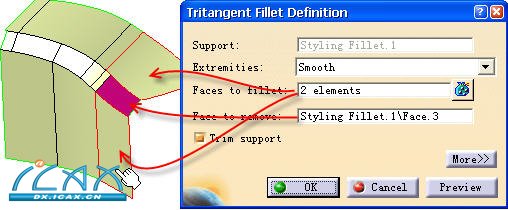 有关更多关于三切线圆角的描述用户可参考零部件工作台“三切线圆角”指令的相关描述。