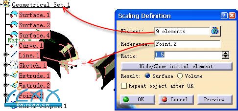 所需元素定义后,单击“确定 (OK)”创建缩放曲面,缩放曲面(标识为Scaling.xxx)即被添加到特征树中。