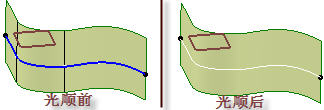 所需元素定义后,单击“确定 (OK)”创建光顺曲线,光顺曲线(标识为Curve smooth.xxx)即被添加到特征树中。 下面我们来看看用光顺前和光顺后的曲线为轮廓,参考ZX平面拉伸一曲面。采用着色边  显示方式查看对比,如图4-415所示。