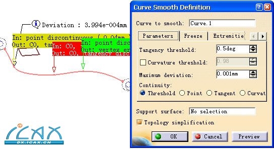 3)曲线光顺。该指令可用于光顺相切和曲率不连续的曲线,以创建更好质量的曲面几何。 打开\Training Part\GSD\ Smooth.CATPart文档,单击“曲线光顺 (Curve Smooth)”  指令。选择需要光顺的曲线,单击预览如图4-413所示。图示中列出了曲线光顺和变形误差的相关信息,并指向相关的接点。 信息中的红色表示在当前的设置及公差范围内,系统无法光顺;黄色表示已改进连续, 绿色则表示已光顺连续。