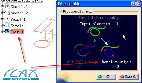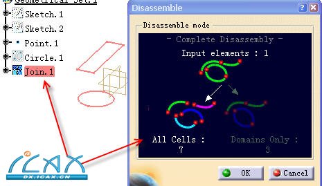 打开\Training Part\GSD\ Disassemble.CATPart文档,单击“分解 (Disassemble)”  指令。选用“所有单元 (All Cells)”分解模式(系统默认)然后选择“缝合.1(Join.1)”作为要分解的对象。分解对话框中列出了输入分解对象与分解后的元素的个数,如图4-417所示。确定后分解创建,被分解的元素关联移除,各自的特征标识列于特征树中,结果如图4-418所示。