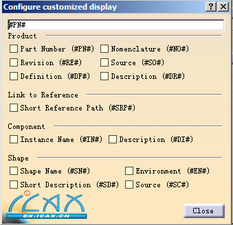 5.17 节点自定义 (Nodes Customization) 1)产品 (Product): 零部件编号 (#PN#) (Part number (#PN#)) 修订 (#RE#) (Revision (#RE#)), 定义 (#DF#) (Definition (#DF#)) 术语 (#NO#) (Nomenclature (#NO#)) 源 (#SO#) (Source (#SO#)), 描述 (#DR#) (Description (#DR#)) 2)链接到参考 (Link to Reference): 短参考路径 (#SRP#) (Short Reference Path (#SRP#)) 3)部件 (Component): 实例名称 (#IN#) (Instance name (#IN#)), 描述 (#DI#) (Description (#DI#))。 4)形状 (Shape): 形状名称 (#SN#) (Shape Name (#SN#)), 简短描述 (#SD#) (Short Description (#SD#)), 环境 (#EN#) (Environment (#EN#)), 源 (#SC#) (Source (#SC#))。 您可以单击所选的框,此选项(例如“描述 (#DI#) (Description (#DI#))”)的图表将自动报告在窗口顶部的空字段中。默认情况下,始终选中 #PN# 选项。 1:参考产品 (Reference Product) 2:已加载参考的产品实例 (Product instance, reference loaded) 3:已卸载参考的产品实例 (Product instance, reference unloaded) |