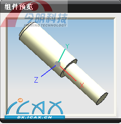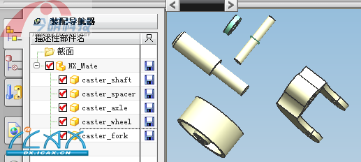 打开Assembly_2文件夹内NX文档 NX_Mate.prt 进人装配模块,先通过装配加载模型部件,在菜单中 装配 → 组件 → 添加组件,打开Assembly_2文件夹内caster_shaft.prt,在绘图区会出现一预览窗口,可以预览加载部件形状。在添加组件对话框中选择放置“绝对原点”将组建定位在坐标原点中,设置选项中可以观察到组件名称,引用集,图层等内容。点击确定,加载组件。加载组件后,第一个组件通常会作为参考组件,其他的组建对它作为配对参考。