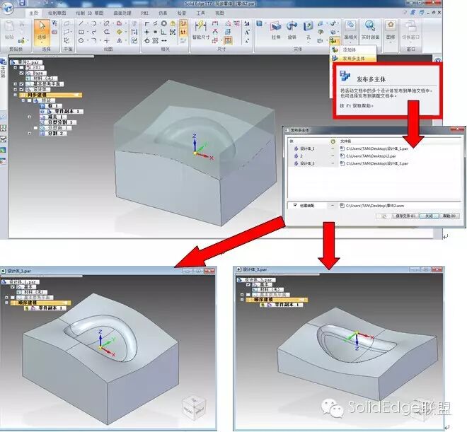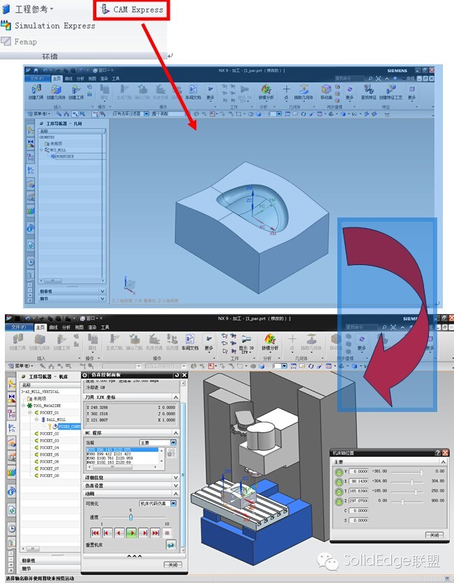 通过零件副本插入需要制作模具的零件。 再利用布尔运算在型腔零件中减去导入的零件形成空腔。 通过曲面处理中的分型分割命令将设计体1进行分割,生成分割线。 利用生成的分割线进一步生成分型面。 通过分割命令将型腔零件分成上下两部分。 通过发布多主体命令,将设计体发布成零件,得到上下两个模具零件。 最后将模具型腔零件导入CAM Express界面,进行NC编程,并进行机床加工模拟。 这样一个工作流,使得模具设计加工的效率大大提高,实现了设计部门到制造部门的无纸化、数据的唯一性,还避免了设计与制造部门之间的交流障碍。